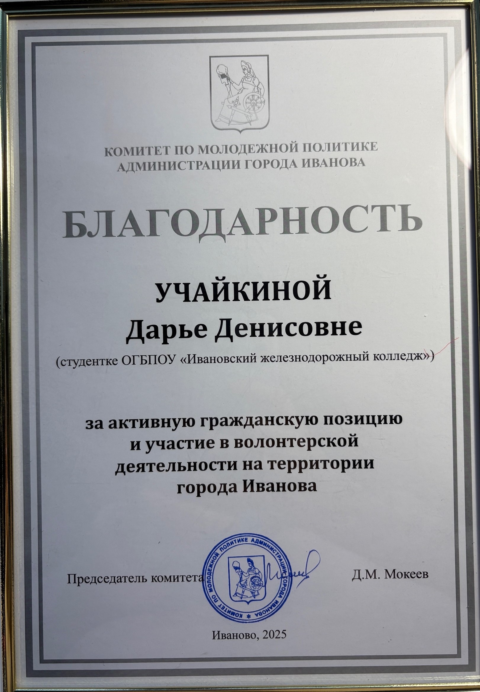 От Ивановского железнодорожного колледжа награду получила студентка 2 курса Учайкина Дарья, которая не только активно принимает участие волонтерской деятельности, но и учится на «отлично»!