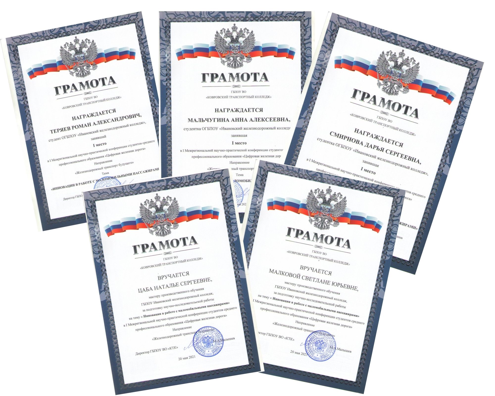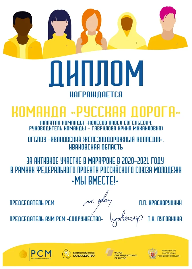 Благодарностями за успехи и активность в общественной сфере, творчестве, спорте и учёбе были отмечены студенты Ивановского железнодорожного колледжа: Рыбаков Антон -награжден благодарственным письмом Департамента образования и науки Ивановской области за выдающиеся достижения в учёбе; Рябов Денис - награжден благодарностью Комитета по молодёжной политике г. Иваново за активную гражданскую позицию и развитие молодёжной политики на территории г. Иваново; –Говоров Игнат - награжден благодарностью Комитета Ивановской области по молодёжной политике за личный вклад в развитие молодёжной политики на территории Ивановской области и в связи с Днем студенчества; –Шеронова Виктория награждена благодарностью Регионального отделения «Движение Первых» Ивановской области за активное участие деятельности движения.