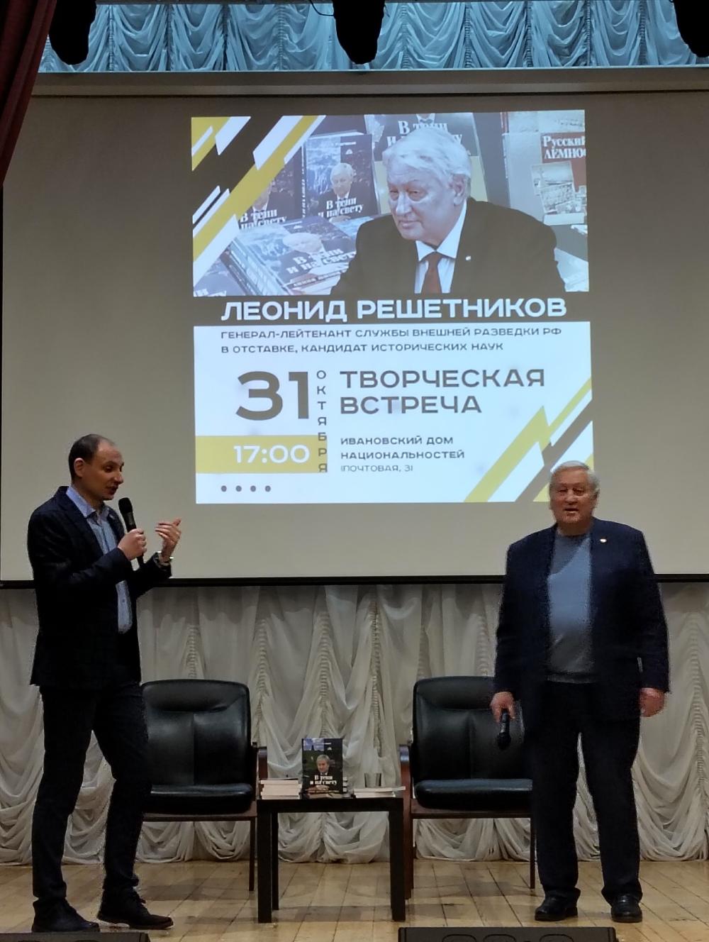 31 октября состоялась творческая встреча с генералом – лейтенантов службы внешней разведки Российской Федерации в отставке, кандидатом исторических наук Леонидом Решетниковым. На встрече была презентована книга автора «В тени и на свету: Линия жизни разведчика».